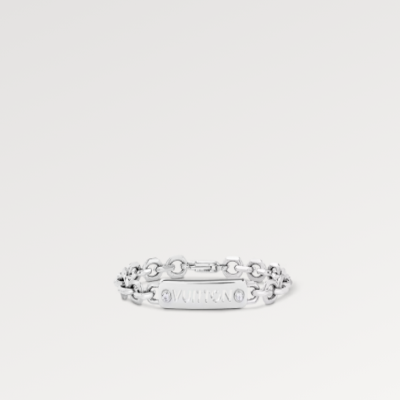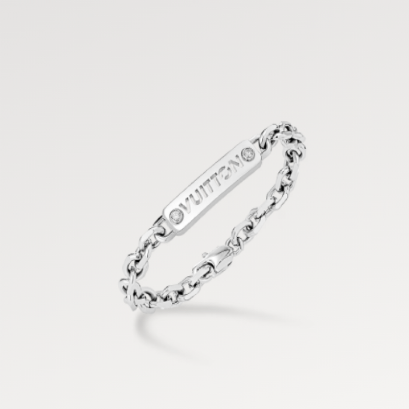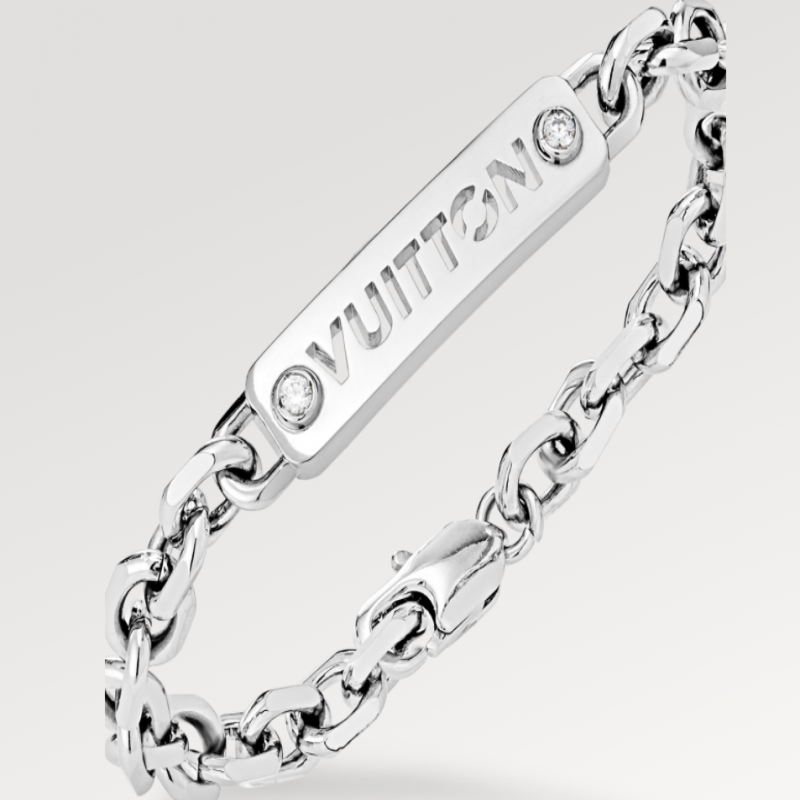 LV ID手鏈以新季筆觸重塑經典設計。 粗獷金屬鏈條銜接中央長方形銘牌,後者採用穿孔工藝抒寫Vuitton之名,兩側水晶閃爍潮流光彩。