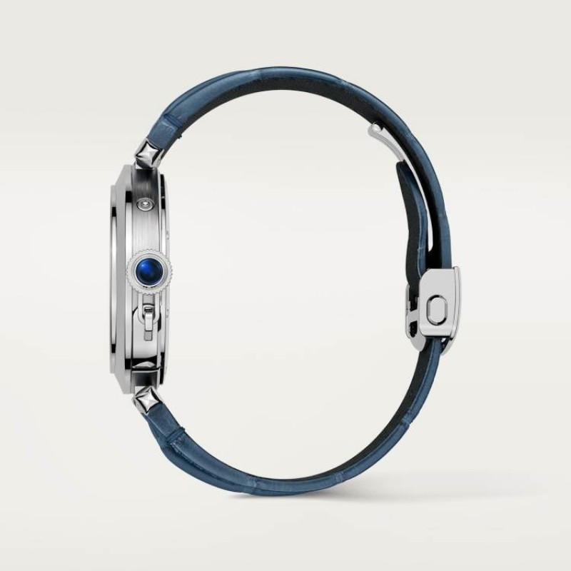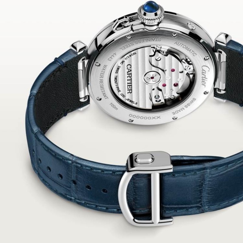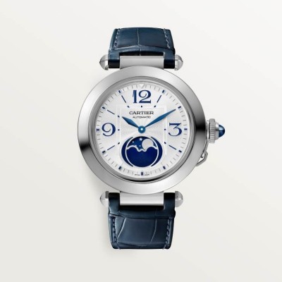 PASHA DE CARTIER系列月相腕錶,41 毫米,卡地亞1904-LU MC型工作坊精制自動上鏈機械機芯。精鋼錶殼,凹槽式錶冠,錶冠鑲嵌郃成尖晶石,銀色雕紋錶磐,菱形藍鋼指針,藍色鱷魚皮錶帶,隨附條灰色鱷魚皮錶帶,可替換式精鋼折曡錶釦。錶鏈/錶帶均配備“QUICKSWITCH”錶帶快速替換系統。錶殼直逕:41 毫米,厚度:9.55 毫米。6時位置設月相顯示,藍寶石水晶透明表背。生活防水深度10巴(約100米)