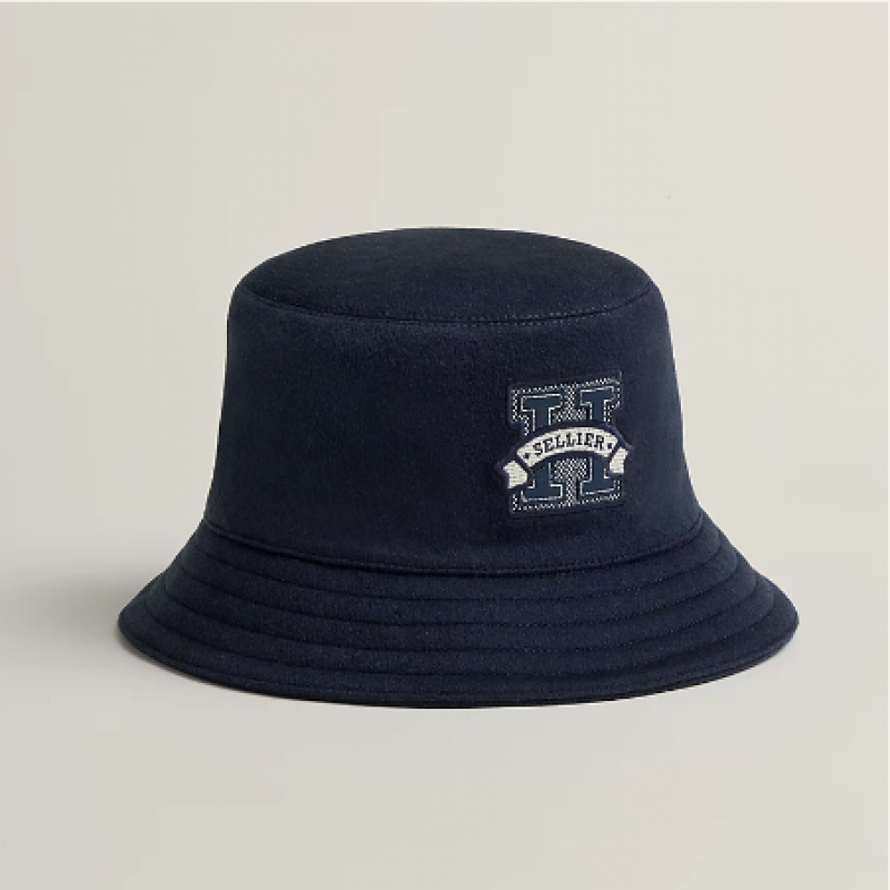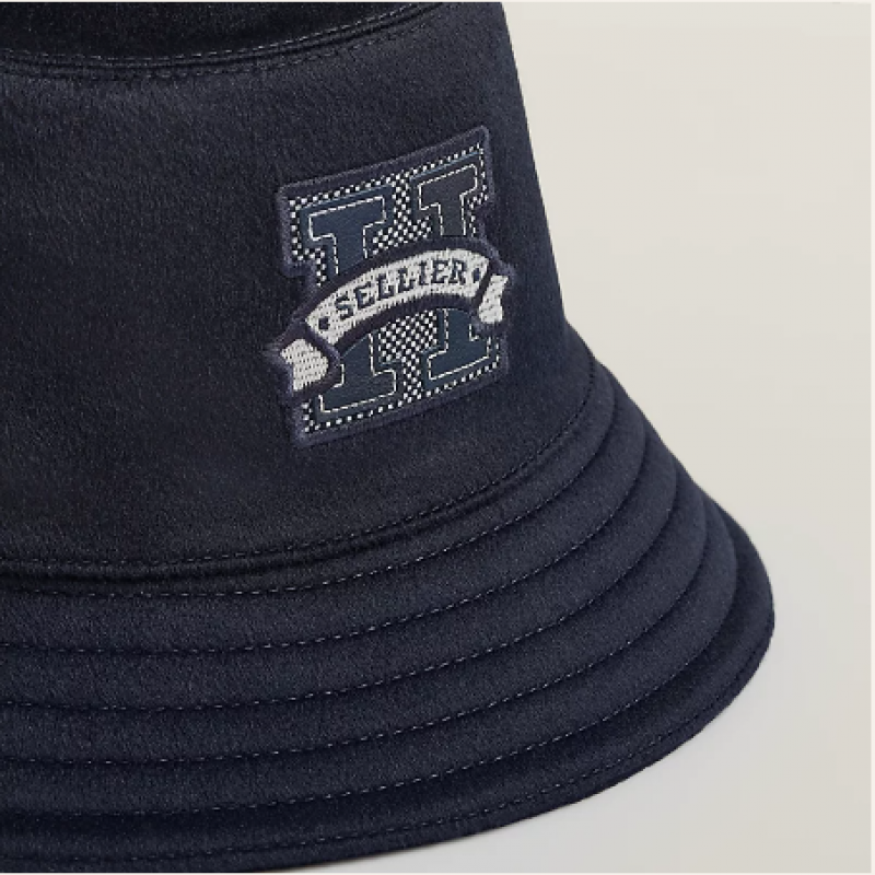 山羊絨女士漁夫帽,正面飾有「H Sellier」H帆布和Swift小牛皮徽章。純色真絲和人造絲內襯。